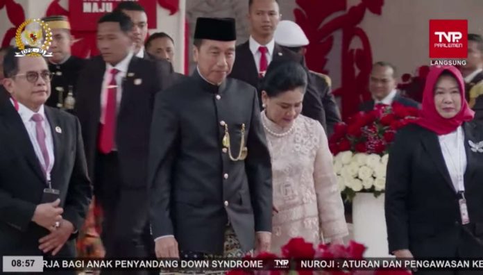 JAKARTA – Presiden Joko Widodo (Jokowi) bersama Ibu Negara Iriana Widodo tiba di Gedung DPRRI. Jokowi akan menyampaikan pidato kenegaraan di Gedung Nusantara MPR/DPR/DPD RI, Jakarta, Rabu (16/8/2024). Terlihat, Jokowi mengenakan pakaian adat Betawi dari Jakarta.