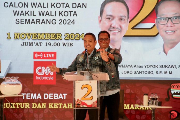 SEMARANG – Calon Wali Kota dan Wakil Wali Kota Semarang, Yoyok Sukawi-Joko Santoso (Yoyok-Joss) mengikuti debat perdana yang digelar oleh KPU di MG Setos pada Jumat (1/11/2024). Debat tersebut membahas tema Ekonomi, Infrastruktur, dan Ketahanan Kota Semarang.