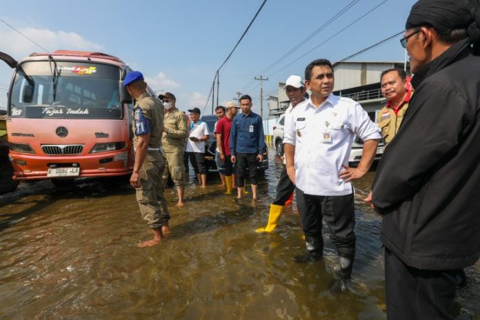 DEMAK – Wakil Gubernur Jawa Tengah, Taj Yasin meninjau kondisi banjir rob yang menggenangi jalan raya pantura Kecamatan Sayung, Kabupaten Demak, Rabu (28/5/2025). Sebab, kondisi banjir rob di jalan itu menganggu lalu lintas warga maupun industri, yang melintas di daerah tersebut.