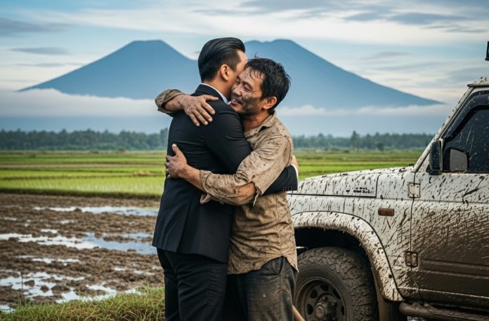 Petani itu menoleh perlahan. Wajahnya yang keriput disinari cahaya mentari pagi. Beberapa detik mereka saling memandang, sebelum akhirnya senyum lebar merekah di kedua wajah mereka.
