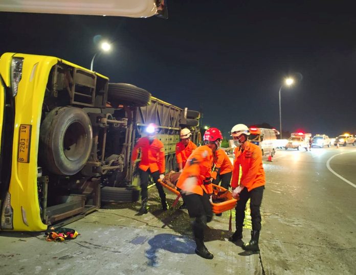 SEMARANG – Sebuah bus pariwisata mengalami kecelakaan tunggal yang tragis di Simpang Susun Exit Tol Krapyak, Kota Semarang, dini hari tadi, Senin (22/12/2025). Bus PO. Cahaya Trans bernopol B 7201 IV yang mengangkut 34 penumpang tersebut terguling setelah diduga hilang kendali, menewaskan 15 orang dan melukai 19 lainnya.