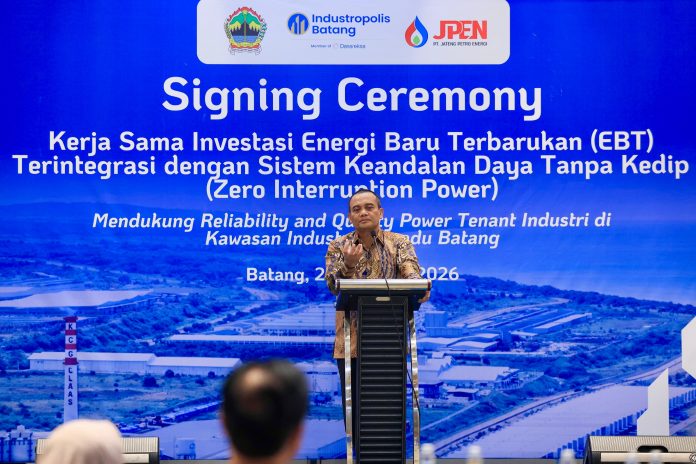 BATANG – Pemerintah Provinsi Jawa Tengah mengebut penguatan energi hijau di Kawasan Industri Terpadu Batang (KITB). Melalui PT Jateng Petro Energi (JPEN), pemprov meneken nota kesepahaman dan Non-Disclosure Agreement (NDA) untuk investasi layanan energi baru terbarukan (EBT) terintegrasi dengan sistem keandalan daya tanpa kedip (zero interruption power), Jumat sore, 27 Februari 2026.