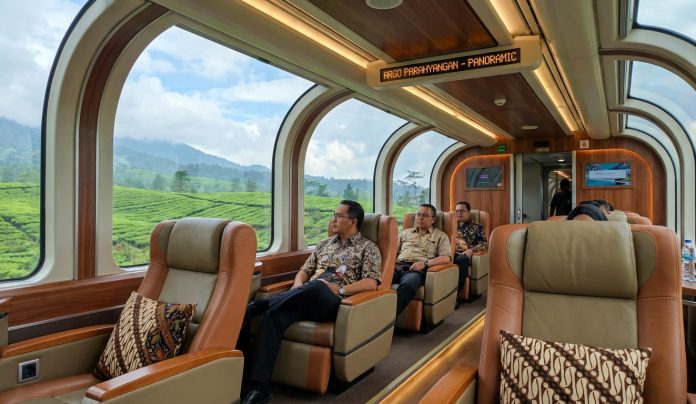 JAKARTA, PortalJateng.id – Bayangkan duduk di kursi empuk, jendela kaca lebar membentang dari lantai hingga langit-langit. Di atas kepala, atap kaca terbuka perlahan, langit biru dan awan putih masuk ke dalam gerbong. Di samping, secangkir kopi hangat masih mengepul. Lanskap pegunungan, sawah, dan lembah bergantian melintas seperti film yang diputar lambat.